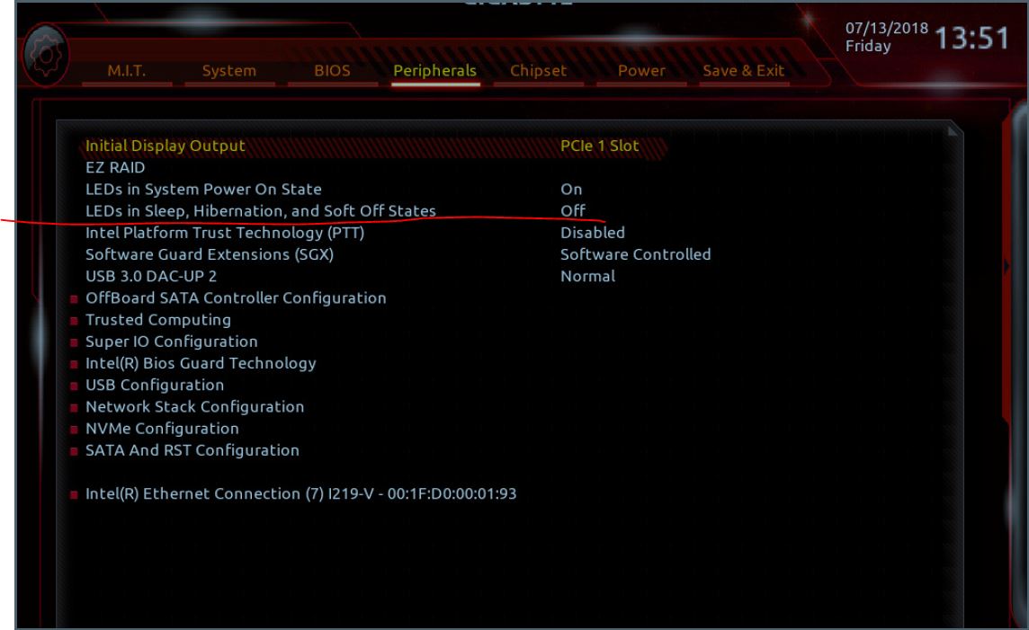 Попробуй в UEFI перейти в раздел "Периферия" и выключить LED, как показано на скриншоте