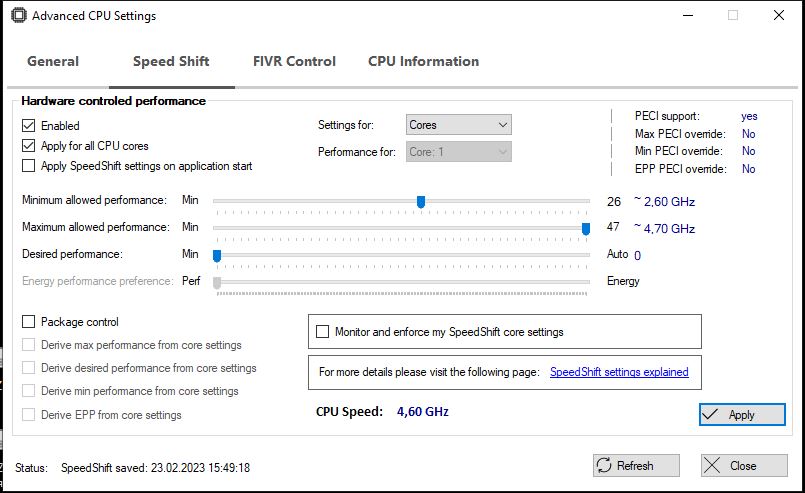 Чтобы мониторить и менять на ходу настройки CPU полезна прога Quick CPU (у меня версия 3.1.5 - более простая и понятная)