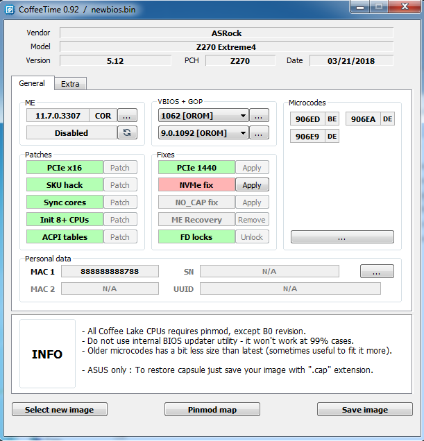 CoffeeTime 0.92 [ Я.Диск ][ Mega ] Автор: svarmod Эта версия не содержит автомодификации, все изменения в биосе проводятся "вручную"; предоставляется без каких-либо подсказок, с GUI, новыми фишками и прочими удобствами. Больше информации о новой версии на [ Страница 407 ]