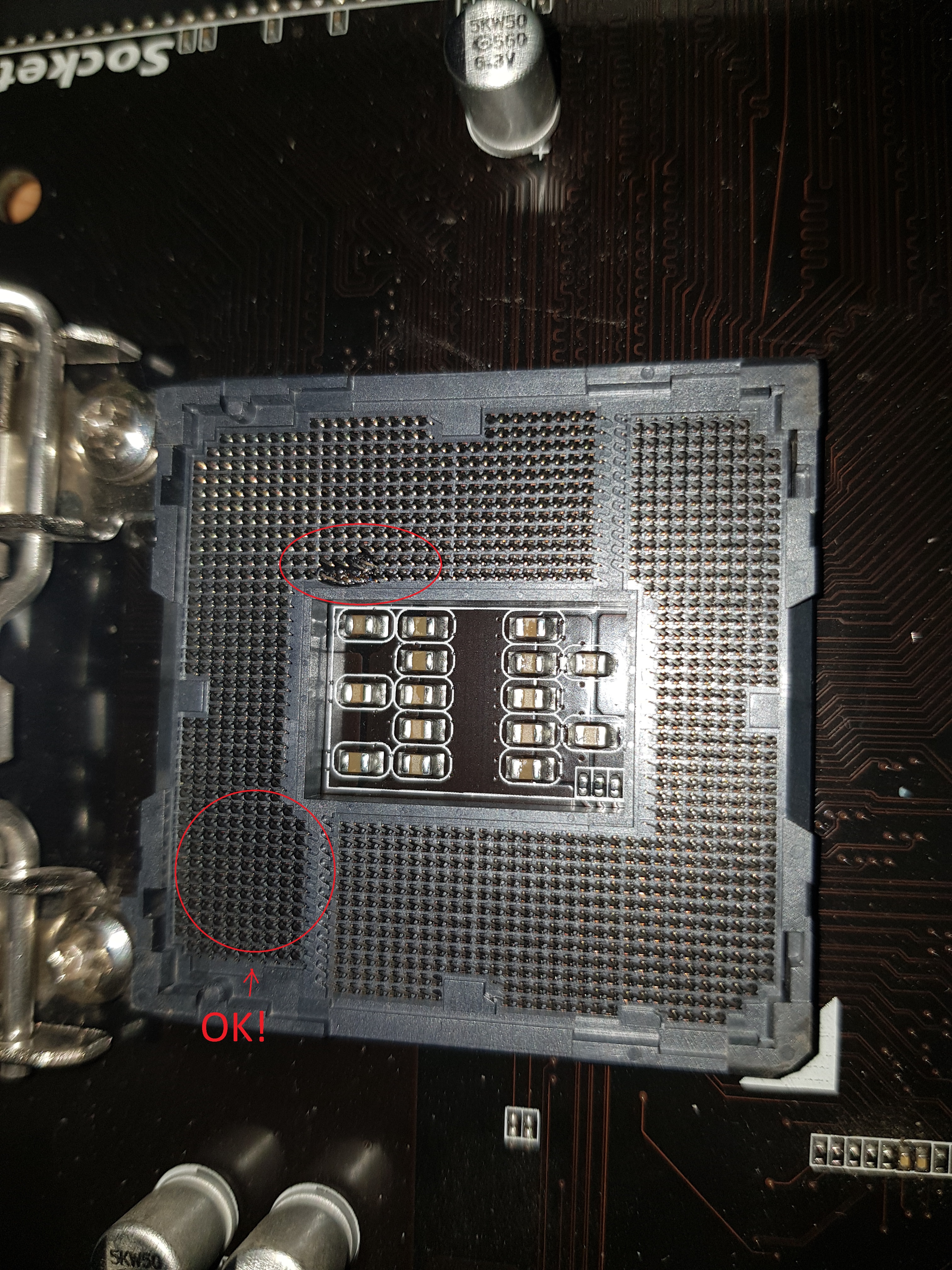 Gigabyte: если не изолировать бОльшую зону контактов, отмеченных красным, то у платы сгорит одна из фаз питания процессора, а контакты останутся целы. Если изоляция есть, но частично сползет, то соответствующие пины в сокете сгорят, как предохранитель. Работоспособность системы в обоих случаях не пострадает.