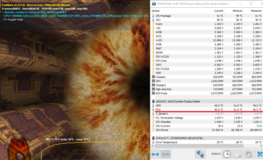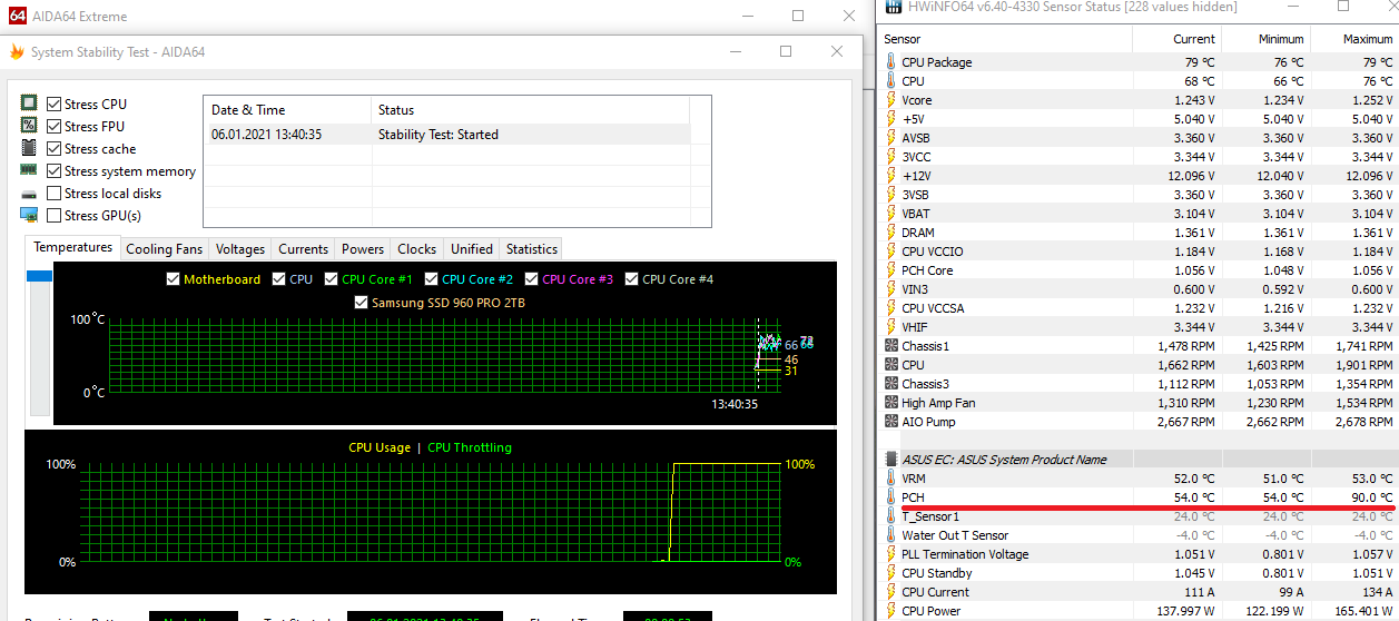 Заметил странность, при тесте видео карты PCH max температура 56С, при тесте проца PCH max температура 54С, но бывает на 1-2 секунды скакнет на 90С и обратно на 54С