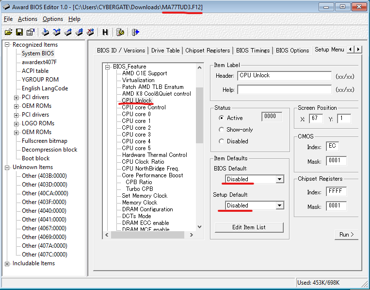 Пытался решить проблему разными путями С помощью софта MC EXTRACTOR вытаскивал из бивиса F12 микрокоды и пытался их вшить в бивис F10 (в нем параметр Core Unlock не отключен) через CBROM Через Award Bios Editor открывал бивис F12 и нашел в нем отключенный параметр Core Unlock, включил его и сохранил изменения, открыл снова и ничего, ничего не изменилось, этот параметр как был отключен так и отключен.