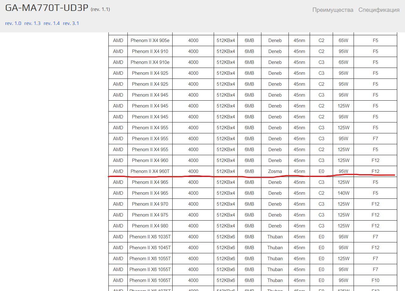 Имеется материнская плата GIGABYTE GA-MA770T-UD3P Rev 1.1 Процессор AMD Phenom II X4 960T