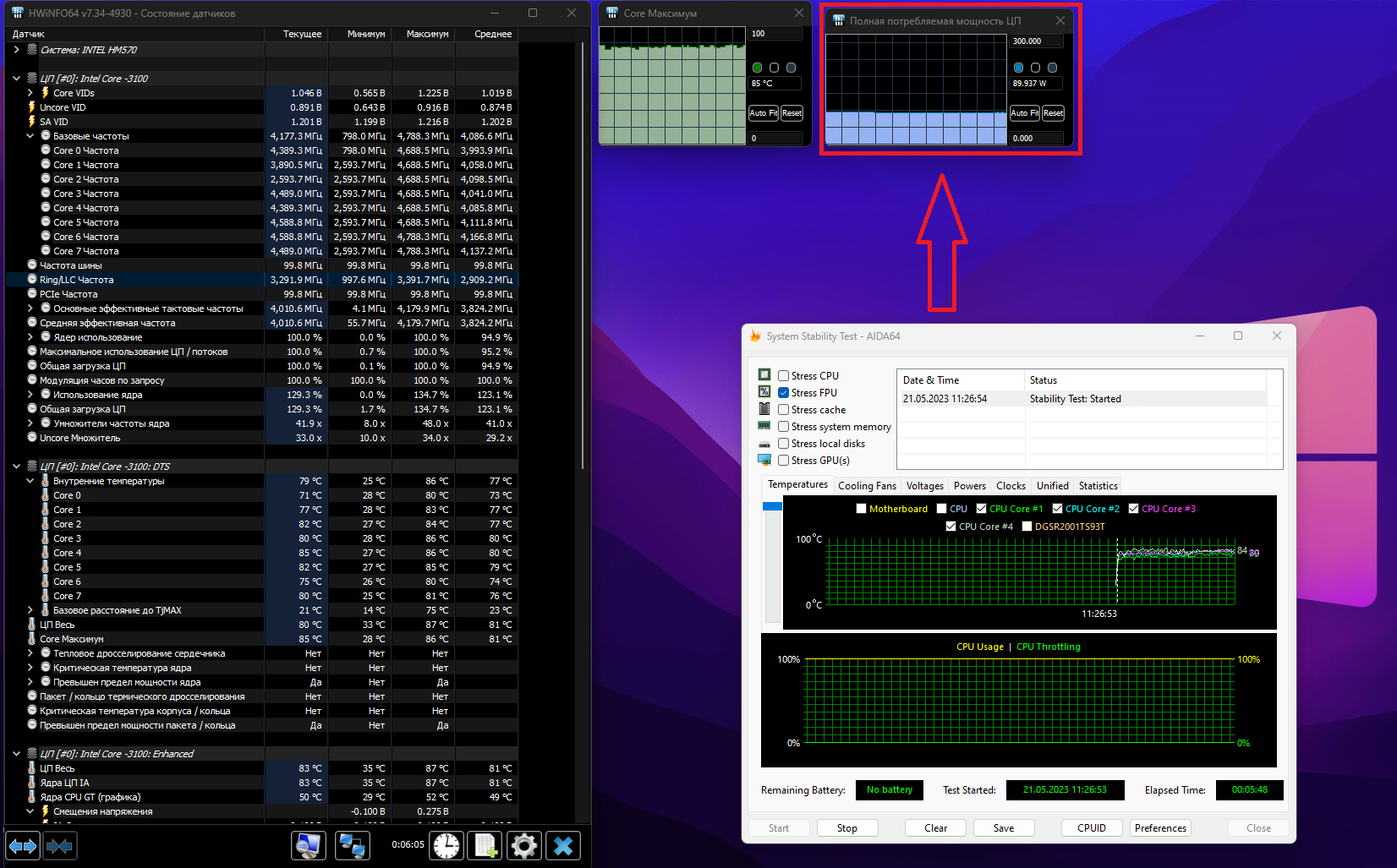 Виноват, не посмотрел туда. Вы бы просто пролистали окно датчиков HWInfo немного вниз - там отображаются значения мощности. Зачем эти отдельные окна? Они только искажают результаты, создавая дополнительную нагрузку на процессор. А при тестировании, например, производительности памяти на системе без внешней видеокарты вообще могут изменить результаты до полного несоответствия реальности.