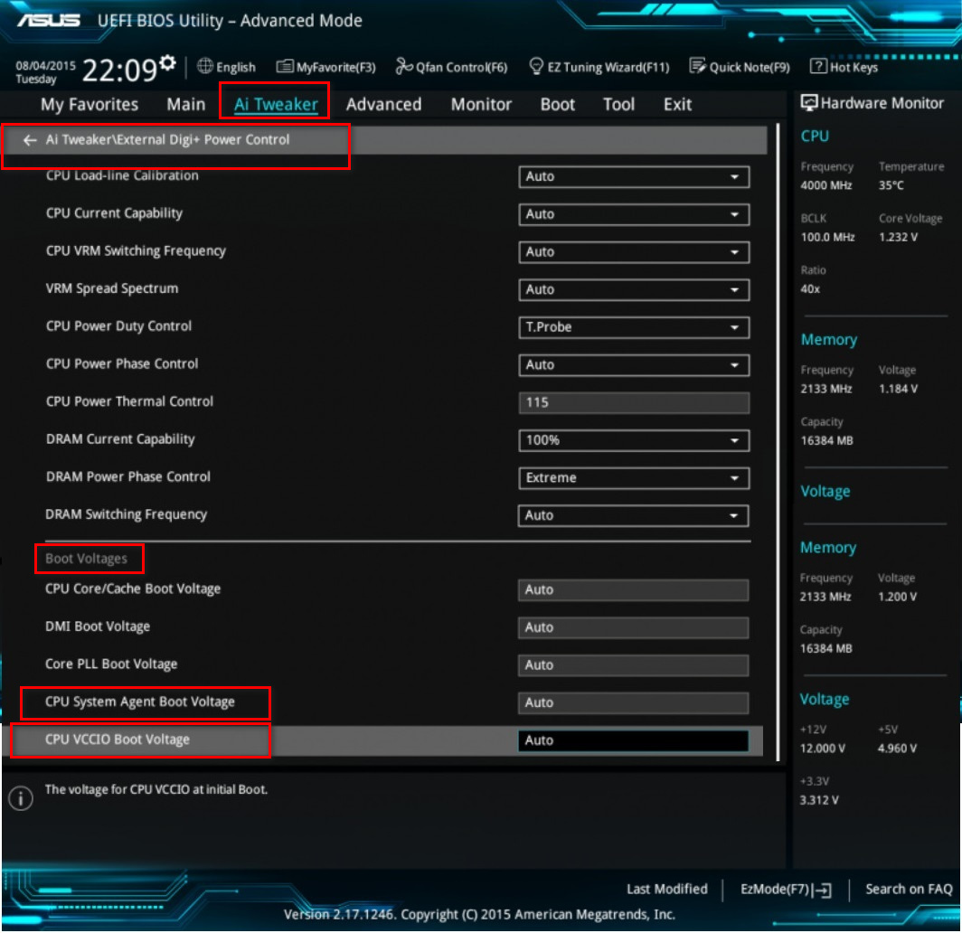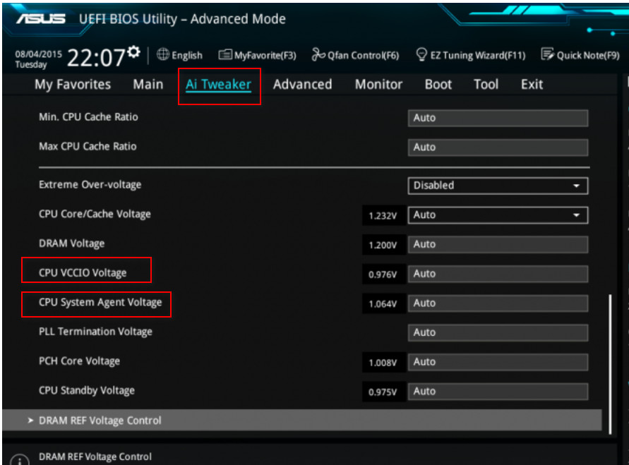 параметры «Boot Voltage VCCIO» и «Boot Voltage System Agent», для обоих выставив «1.1» или «1.2». Шото я не смог найти эти пункты в биосе. Asus z170 delux.