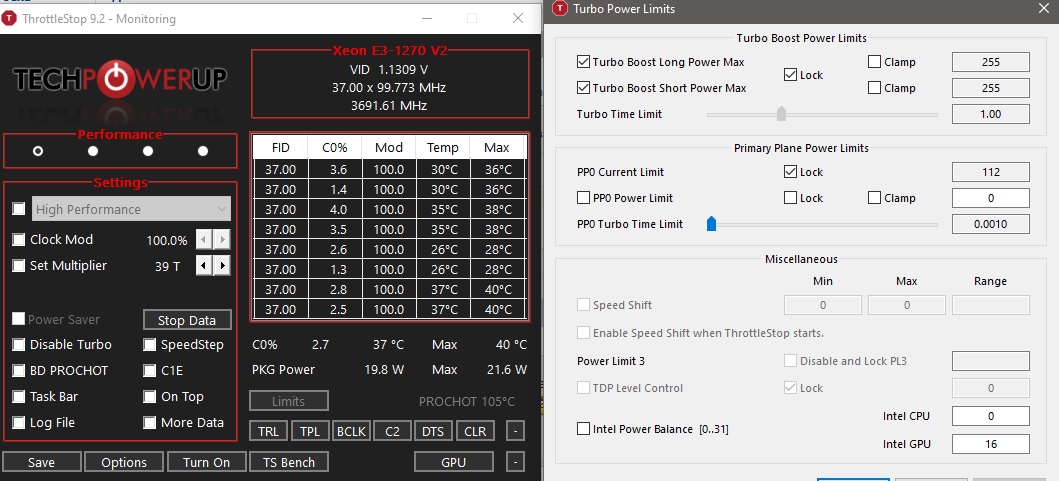 Jexa, нажми, пожалуйста, на кнопку TPL в нижней строчке менюшек, там и увидим, есть ли ограничение по мощности. У меня на 4980hq вообще по умолчанию выставляется 4095 Вт По даташиту 47. Во как.