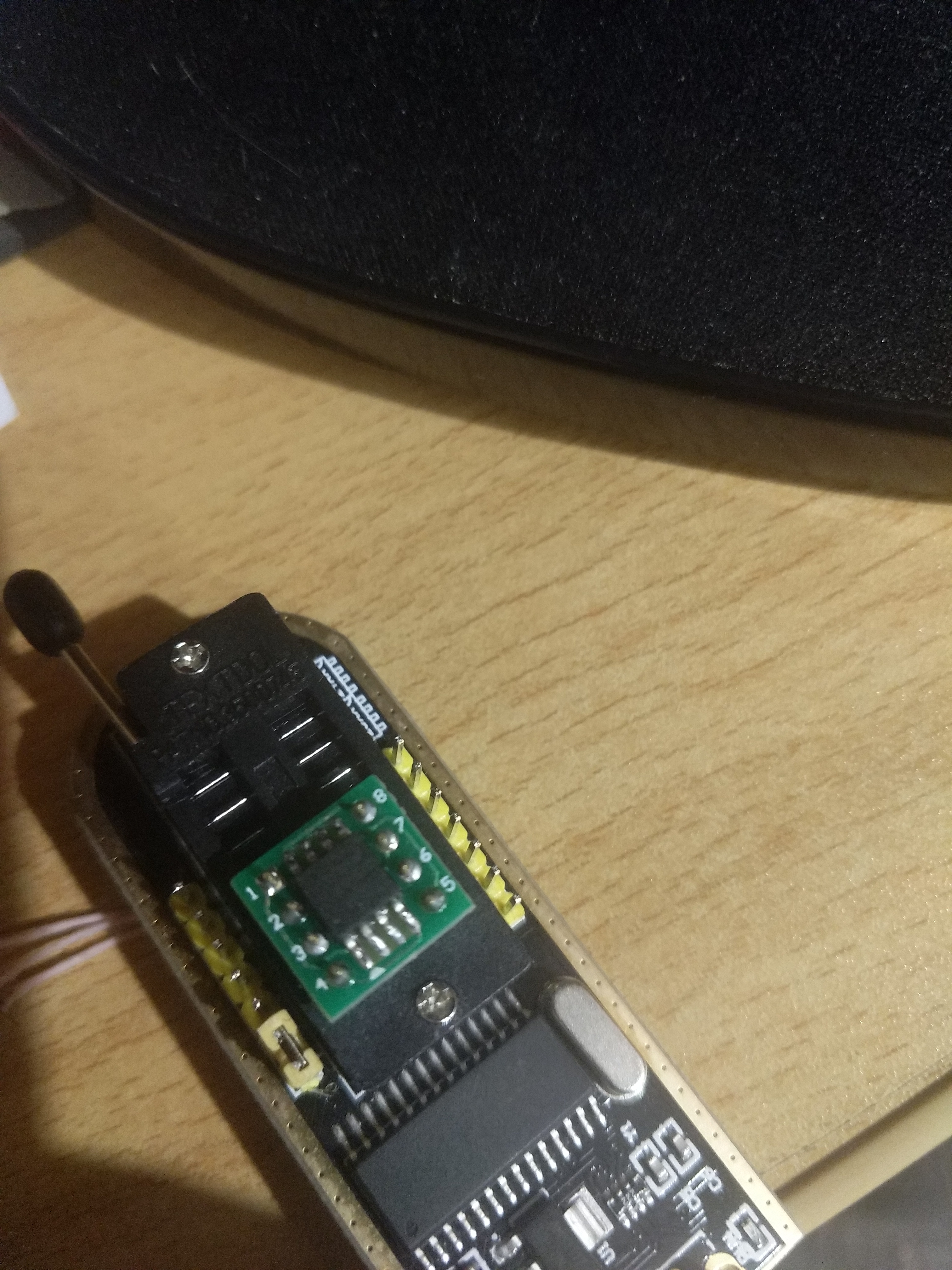 Я вчера бэкап слил программатором с прищепкой с платы Huananzhi x79 2.49P1, программатор не читал биос пока не подсказали изолировать плюсовой контакт. https://imgur.com/iDV2e2h