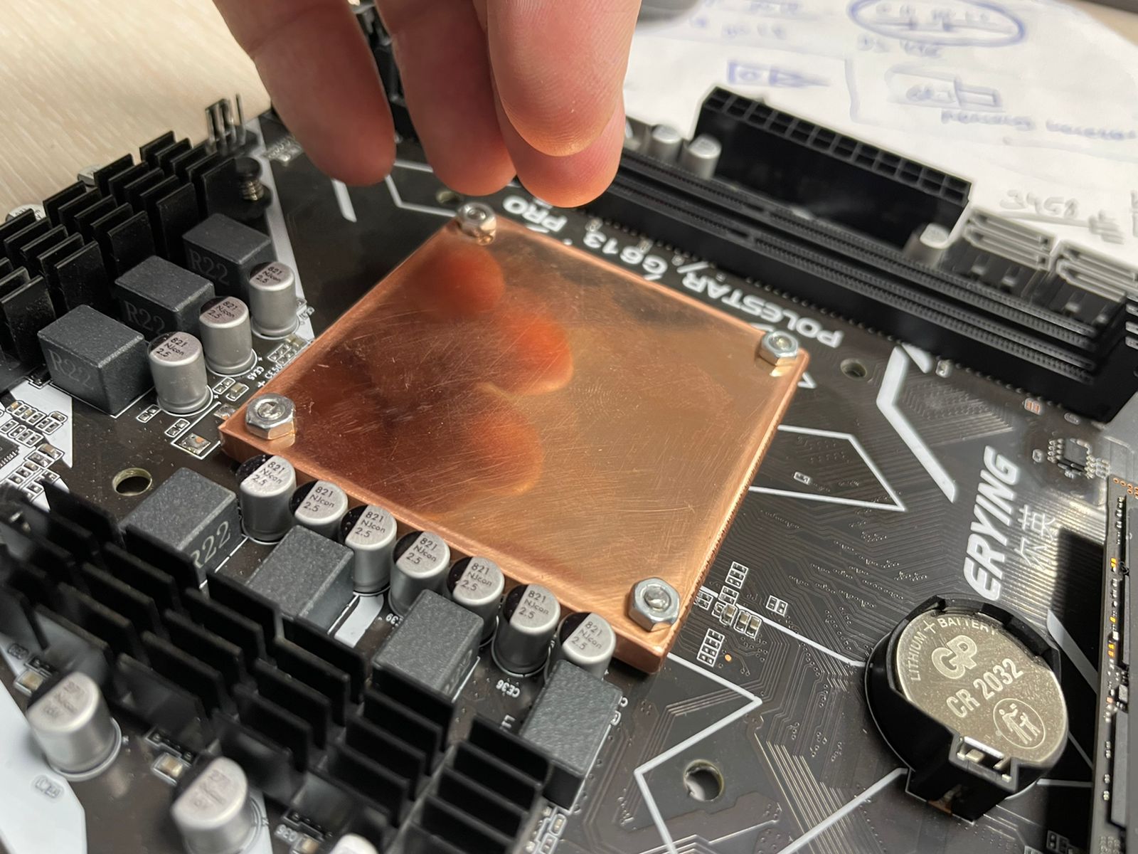 Всем привет! Вернулся к Вам с очередной порцией "безумия" . Последний мой пост был о том как ЖМ сожрал алюминий радиатора и мне пришлось колхозить установку кулера с радиатором на сам кристалл процессора (из того что продавались в наших далеких краях ) - получилось печально. После того я заказал лист меди 100х100 толщиной 6мм с алика и стал терпеливо ждать... На днях он ко мне приехал!!!! . Принялся изготавливать чисто медный радиатор в размеры старого 60х60х6. На развлекался ..... словами не передать как. Ушатал 4 сверла... кто бы мог подумать что медь просверлить проблема .... изначально хотел насечь резьбу на отверстиях но в первом же отверстии благополучно похоронил сверло ... в общем пришлось делать отверстия чуть шире и притягивать гайкой, благо зазор остается для них. В общем смотрите в фото результаты. В кратце с трудом при обработке меди но в итоге получилось сделать достойный вариант. Более того температура относительно старого радиатора с жм упала с 87 градусов до 81 при равных настройках - 4,5 Ггц на каждое ядро. Все это охлаждается 92мм вентилятором с радиатором Jonsbo. Так что думаю при охладе серьезней, можно выжать из камня очень неплохие показатели. Пластину шкурил до зеркала шкуркой в ручную 240 400 600 1000 1500 2000 .