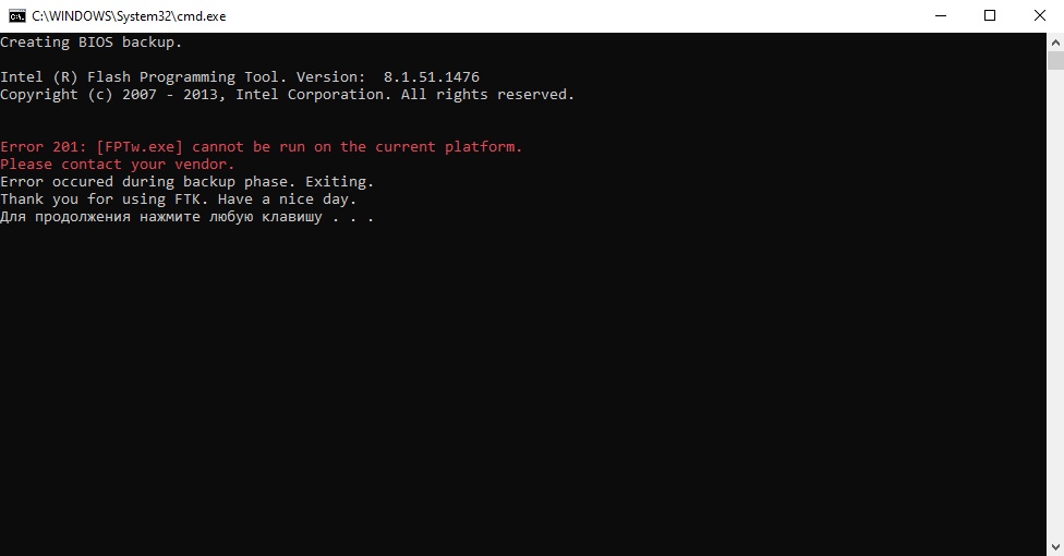 Спасибо вам за модифицированный биос! В личку писать не могу еще =\ Переименовал фаил биоса и положил в папку с FTK которую вы сбросили. Запускаю reflash.bat от Администратора и появляется ошибка при создании бэкапа вроде.