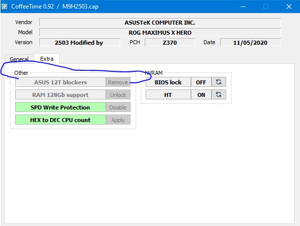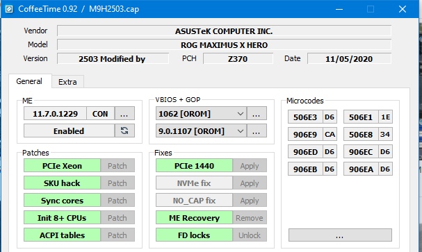 Мать ASUS Q170S1, биос 4210, процессор Coffee Lake B0 (i3-9100) С помощью CoffeeTime_0.85a добавил микрокод, убрал FD lock, добавил SN, UUID и MAC, прошил через программатор и прищепку. Комп стартанул, проц видно, но система не грузится, пробовал грузиться в WIN10 c sata диска, пробовал загрузочную флэшку с 10кой и USB CDROM, на каком то этапе после начала загрузки (начинает крутиться кольцо из точек) комп-р перегружается, на старом KabyLake проце все грузилось с этих же устройств. Скачал CoffeeTime_0.92, подгружаю свой мод биоса, МАК почему-то пустой. Остальное все в норме, в чем может быть проблема?