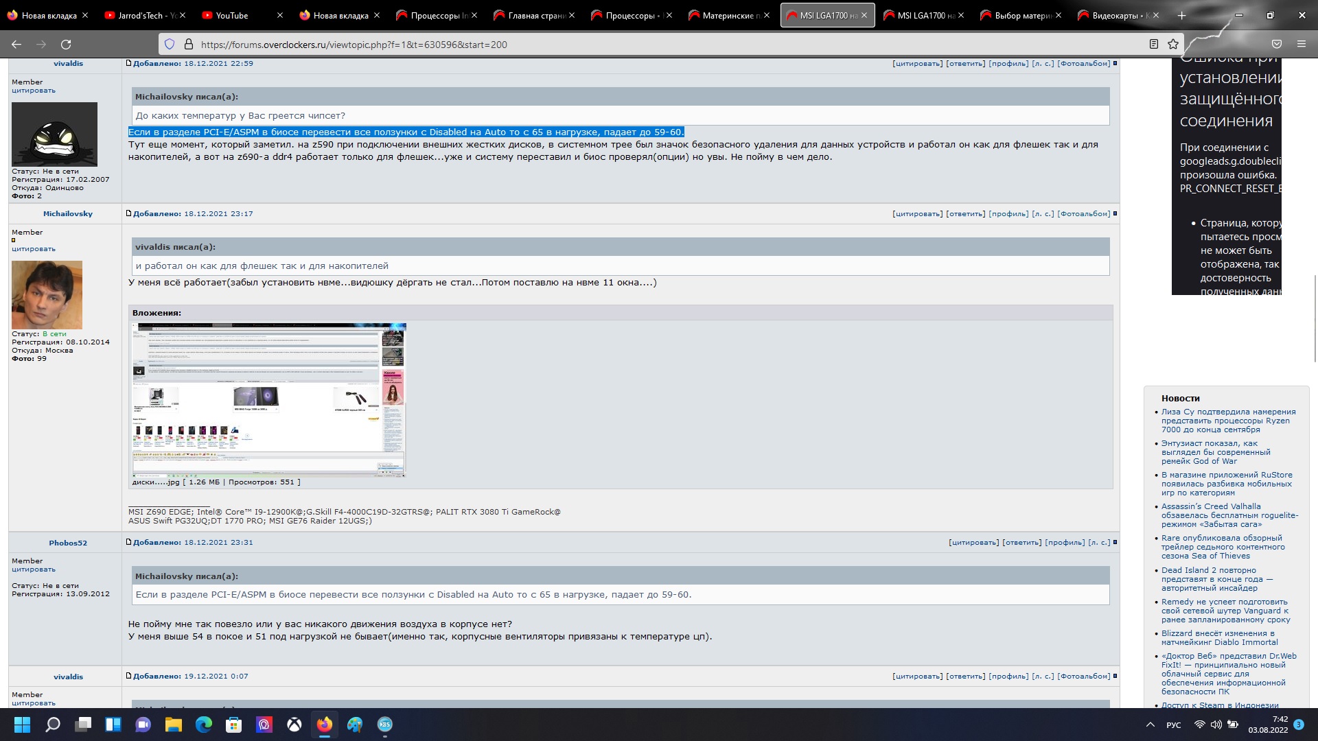 Msi support Приветствую, а можете поднять вопрос перед вашими разработчиками - что собственно они такого намудрили, что после биоса 1.4 для z690-a ddr4 напрочь убили разгон оперативной памяти. Собственно в чем суть: есть комплект памяти gskill F4-3600C16D-32GTZN(DDR4-3600 CL16-16-16-36 1.35V) который на биосе v1.4 спокойно работает с таймингами 17-17-17-37 и частотой 4000, вольтаж на память 1.35в. на версии биоса 1.7 и на новой бетке 1.81 память работает только на xmp профиле. Помогает опция Memory try it но память стартует уже с таймингами 17-18-18-39, частотой 4000 и напряжением на питание 1.4в. Но даже это не самое плохое - винда(win11 pro) с такими настройками постоянно крашится. хотя на 1.4 биосе все работает просто идеально. Хотелось бы понять, что пошло не так с разгоном памяти в новых биосах. Ответ - остаться на 1.4 биосе логичен, но в новых добавили много гибких настроек для aspm, и остальных плюшек, собственно хотелось бы обновится и не потерять разгон памяти и стабильность работы.