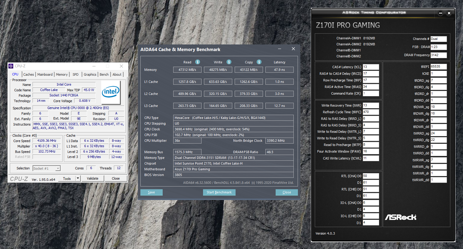 BCLK поднял до 102.75. Множители зафиксировал на 40/36/36/35 на 1, 2, 3 и 4 ядра соответственно. Частоту кэша зафиксировал на множитель 33. Множитель оперативной памяти удалось поднять до 30.66, что с учётом шины дало результат в 3151MHz. Тайминги можете посмотреть в прикреплённом изображении. Напряжение на VCCSA и VCCIO 1.25V. Снижено напряжение на процессор оффсетом -60mV. Напряжение на оперативку поднял до 1.45V