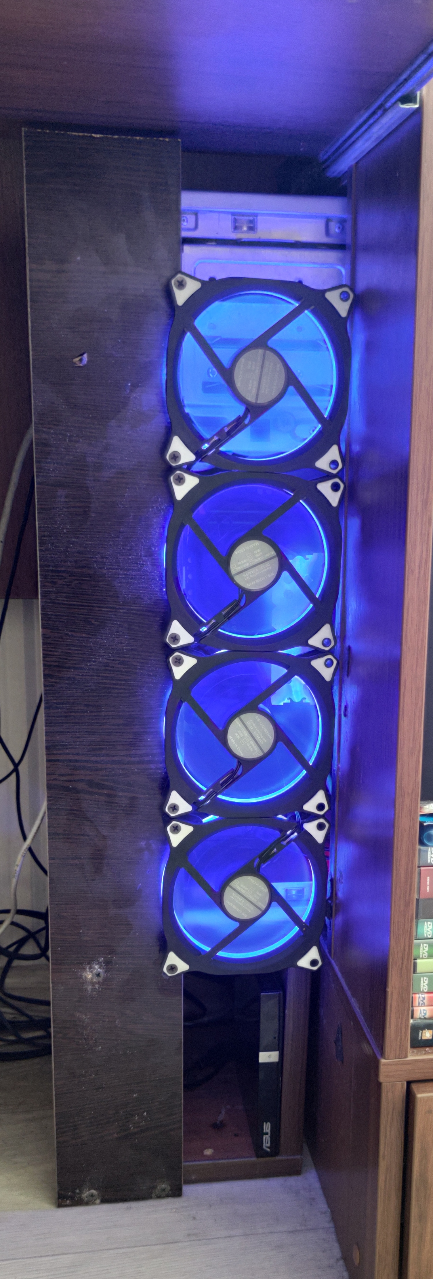 Это под столешницей. Стол под системник делался. Чтобы лазить к задним портам проще было - задняя часть системника выедена под столешницу, а так как морда наоборот далеко) - Привод там же, сзади. Хаб усб 3 - лежит на столешнице от всего этого "счастья". Колхоз дело добровольное. (У меня же нет нагрузок под 2 сокета))) А вот под нагрузкой они (откуда она взялась?! Это скрытый майнинг!) до 66 грелись.. И при этом процессорные кулеры разгонялись до заметного на слух состояния. (Это с учетом наличия в корпусе 4*120 и 2*90 (не считая вентилятора БП)). Так, что еще 4*120 установленные таким образом можно описать "Значит сработала эта хреновина". p.s. Под стол специально не смотрю - меня не напрягает. Гости только в восторге.