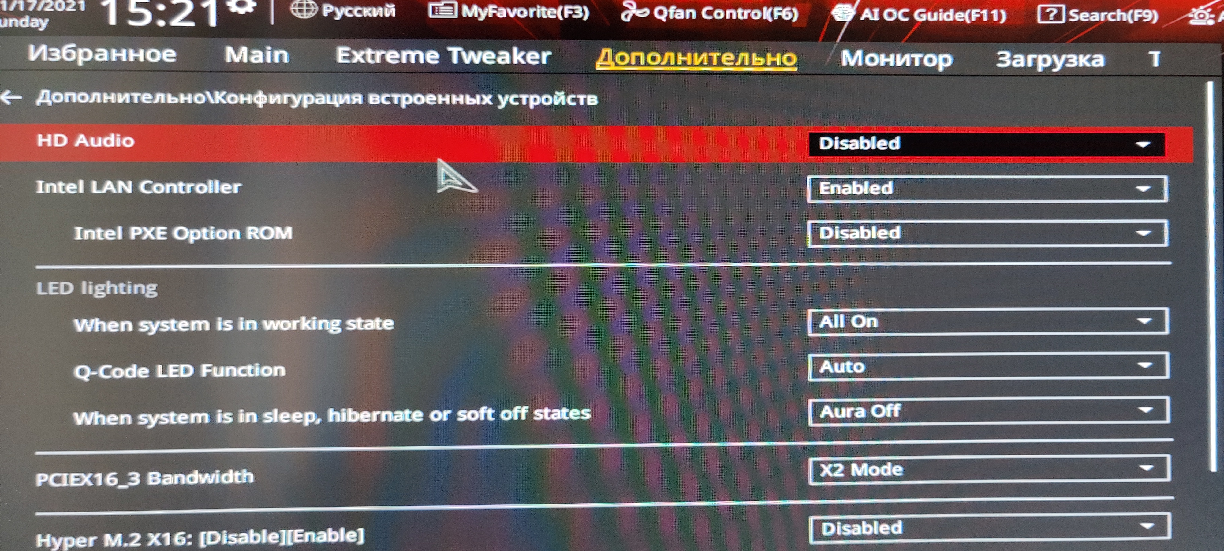 После нескольких месяцев мучений с попыткой заставить стабильно работать новую мать Gygabyte, вернулся таки на ASUS, чему несказанно рад! Материнка ASUS ROG STRIX Z490-E GAMING, (БП Be Quiet! Straight Power 11 - 850W, камень INTEL Core i9 10900, память 2x16Gb Patriot Memory VIPER STEEL PVS432G360C8K, 3600 МГц (XMP), видюха MSI AMD Radeon RX 5700 XT EVOKE, системный диск NVMe Samsung 970 EVO Plus 250 GB + еще пару HDD под файлы) - ровно на том же железе, которое жестоко зависала даже по длефолту на Гигабайт - с полоборота завелась и работает))). Есть один маленький нюансик - хочу поставить свою старую, надежную звуковуху Creative Sound Blaster Zx - но не смог найти, как надежно убрать встроенный звук Realtek на ASUSe, чтоб не конфликтовал c SB? Ткните носом в пункт BIOS, плиз...