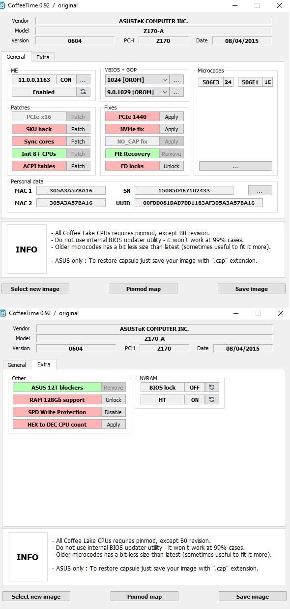 На модифицированных биосах по-прежнему будут работать серийные Skylake и Kaby Lake, если оставить их микрокоды (506E3 и 906E9 соответственно).