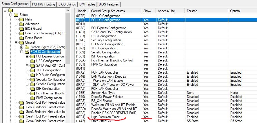 Кто-нибудь может подсказать, почему при открытии файла биоса в программе AMIBCP51 там есть пункт "Chipset->PCH-IO Configuration->High Precision Timer", но в самом биосе не отображается ? В disable это я сам изменил и прошил уже, но как узнать применился параметр или нет хз.