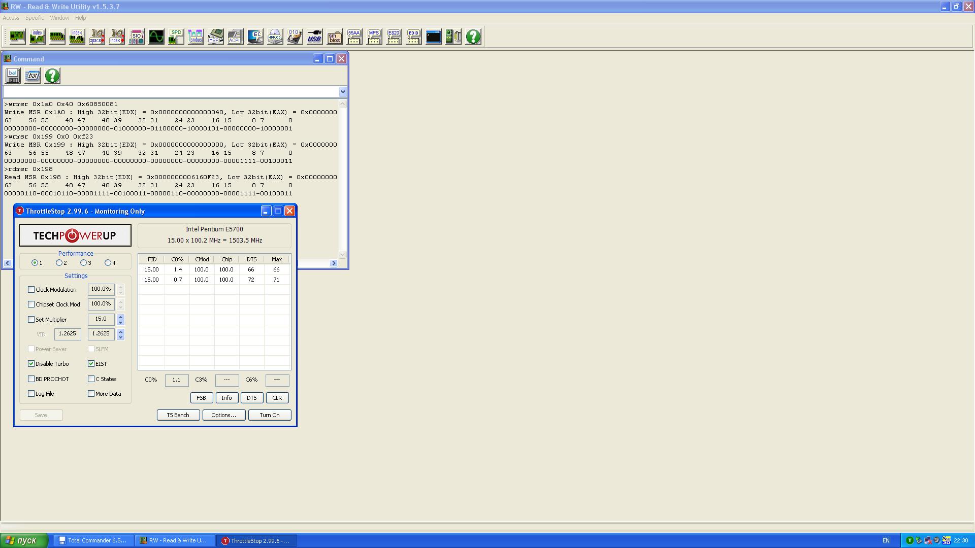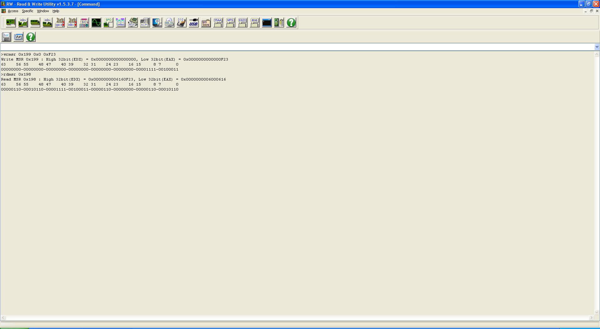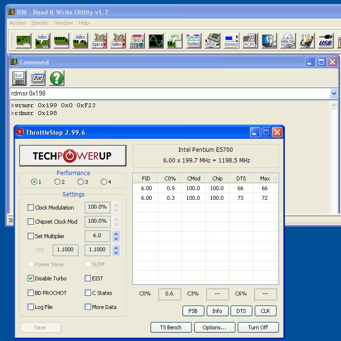 radical Ну теперь открываются просторы для экспериментов. 0xF23: 0xF (15) - множитель (FID), 0x23 - это VID. Или попытаться только включить EIST первой командой, а потом управлять при помощи ThrottleStop