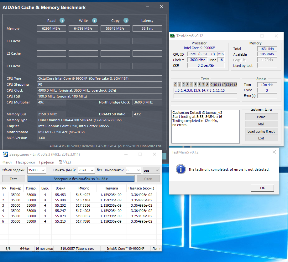Meg Ace конечно не топовая плата по разгону памяти, почему-то латенси выше чем у других матерей, тех же ASUS и Asrock, хуже только Gigabyte. 4 планки выше 4000 не едут, 2 планки работают на 4300 cl17, и то tWRWR_sg и tRDRD_sq не ужимаются, если ужать - пост не проходит. Конечно не говорю, что с платой какие-то проблемы, но для меня это 4 из 5. Процессор удалось разогнать до 4.9 (avx 0) на llc4, vcore 1.296, Cinebench R20 5214 очков выдает. Напряжение конечно не маленькое, но я думаю это процессор не такой удачный попался.