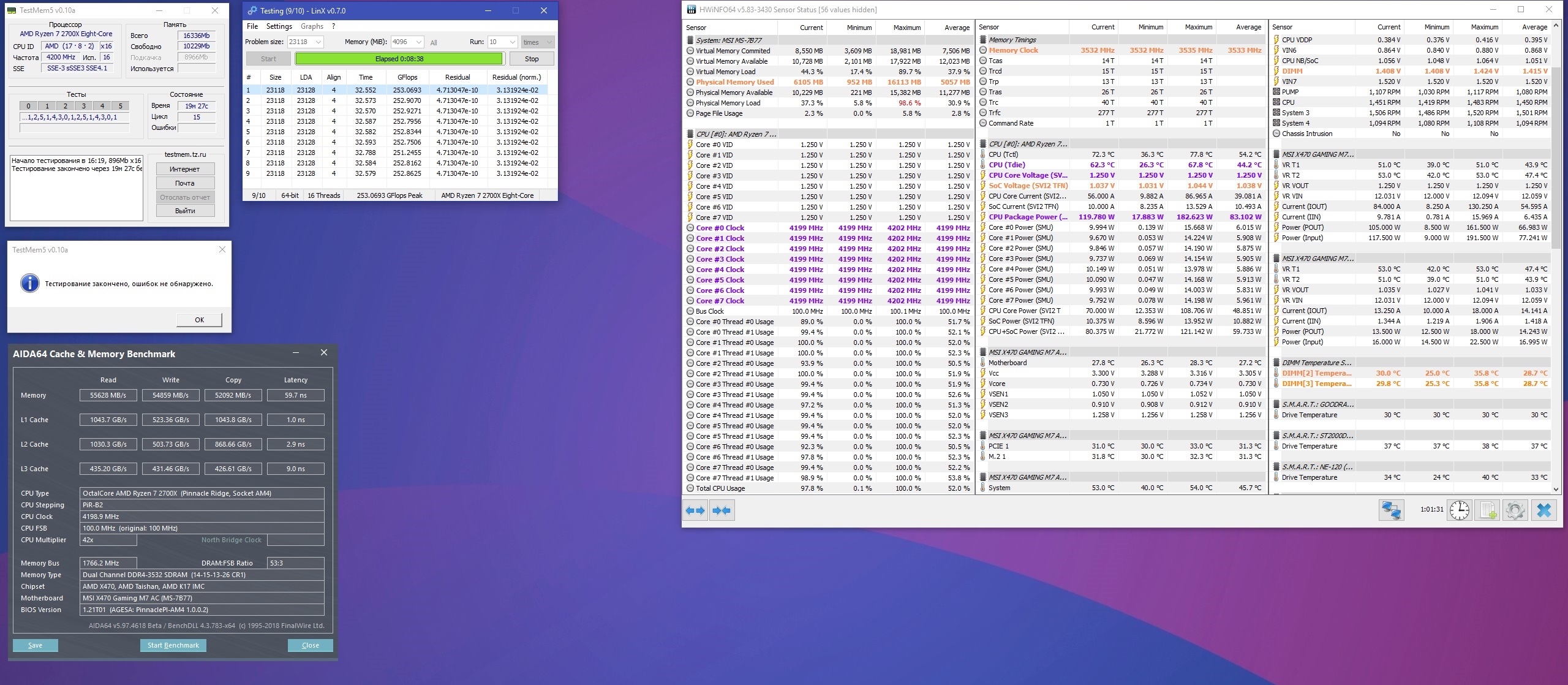 kirill22092 Вот у меня Х470 М7. R7 2700X все по дефолту, в линксе при более 4000 на все ядра( под водой без обдува) я спокойно на врм держу секунды 4 палец . Зато память сходу взяла xmp профиль на 3600 18-19-19.