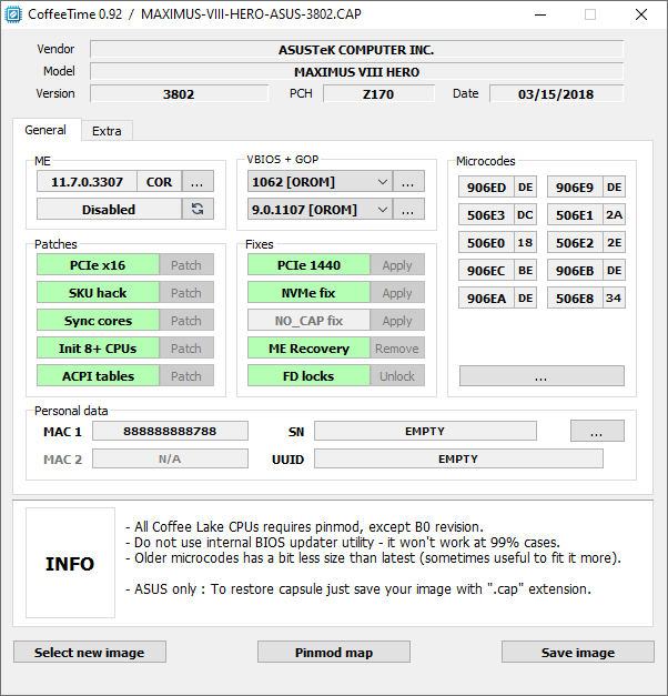 Привет. Кто может скинуть модифицированный биос для ASUS MAXIMUS VIII HERO? поиском не нашел. Ну или подскажите, подойдет ли инструкция в шапке для модификации через CoffeeTime 0.92 ? Процессор QQLT