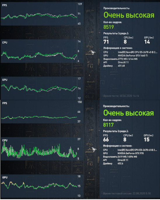 Народ, вот два теста в assasin's creed origins. Сверху взят с просторов интернета, а снизу мой, проц одинаковый.В первом график времени ЦП гладкий, у меня пилой. Что тут может быть? Может кто поделится аналогичным тестом?