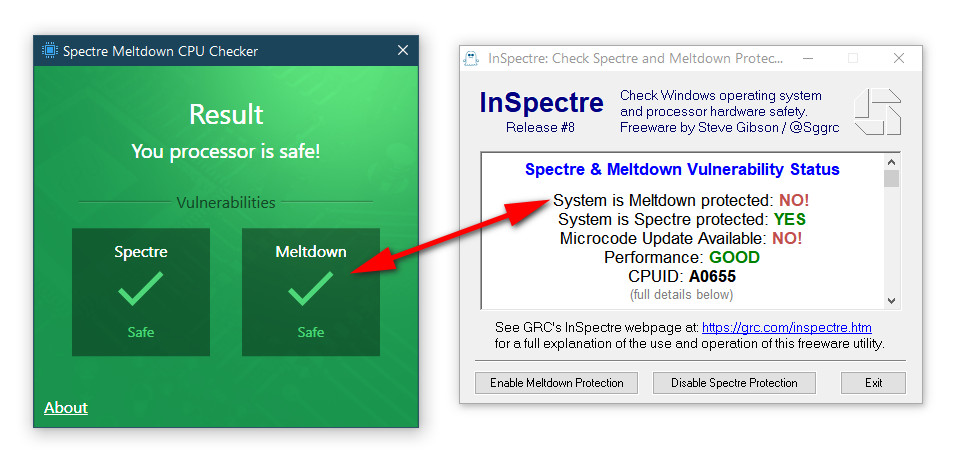 Версию микрокодов можно через UBU посмотреть, если знать, в какой версии микрокода появилась искомая защита от Spectre. Защита от Meltdown осуществляется средствами ОС, если не изменяет память.