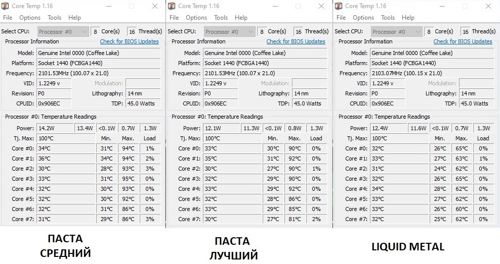 Результаты: Дельта температур по ядрам (между самым холодным и самым горячим) менялась в пределах от 10 до 13 градусов (на 3 градуса). Сами температуры тоже менялись заметно, самое горячее ядро в разных вариантах прижима при прогреве имело разницу в 8-9 градусов. В самом плохом варианте был троттлинг. Замена на ЖМ - комментарии излишни, все видно на картинке.