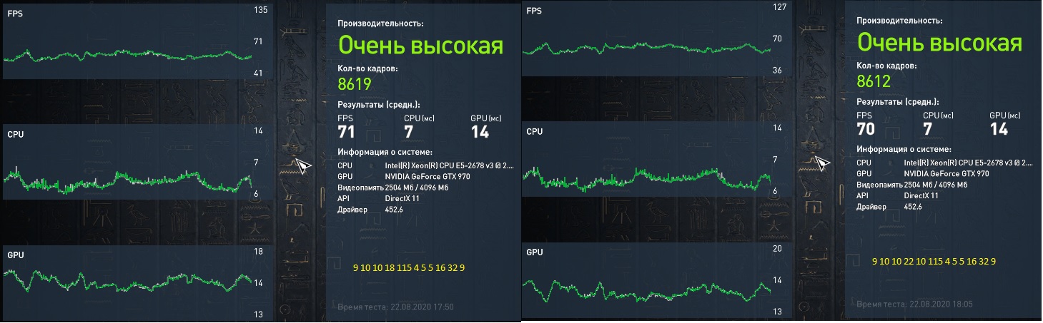 Режим ВКЛ низкой задержки не повлиял, по кадрам вроде столько же, но график более ступенчатый, а установка режима в УЛЬТРА вообще убило производительность. Касательно задержек в итоге вторички мне кажется немного помогли, но это не точно(хотя b0 бывал пару раз при перезагрузке, походу пережаты чуток). Но мне кажется банальный разгон видюхи помог больше, видимо он тоже влияет на время ЦП как это не парадоксально, возможно дольше пишет или ждёт пока видюха обработает данные, хз. Результат 9 10 10 18 vs 9 10 10 22. Прогонял трижды каждый тест, по мне пиков меньше на 18 таймингах. ЗЫ у меня отказывается десктопная ддр3 1600 работать на 2133 стабильно, к тому же одна плашка которую пришлось докупить оказалась на других чипах самсунг, я думаю она похуже. Но может быть вторички как-то улучшат ситуацию, если кто предложит тайминги буду рад попробовать.