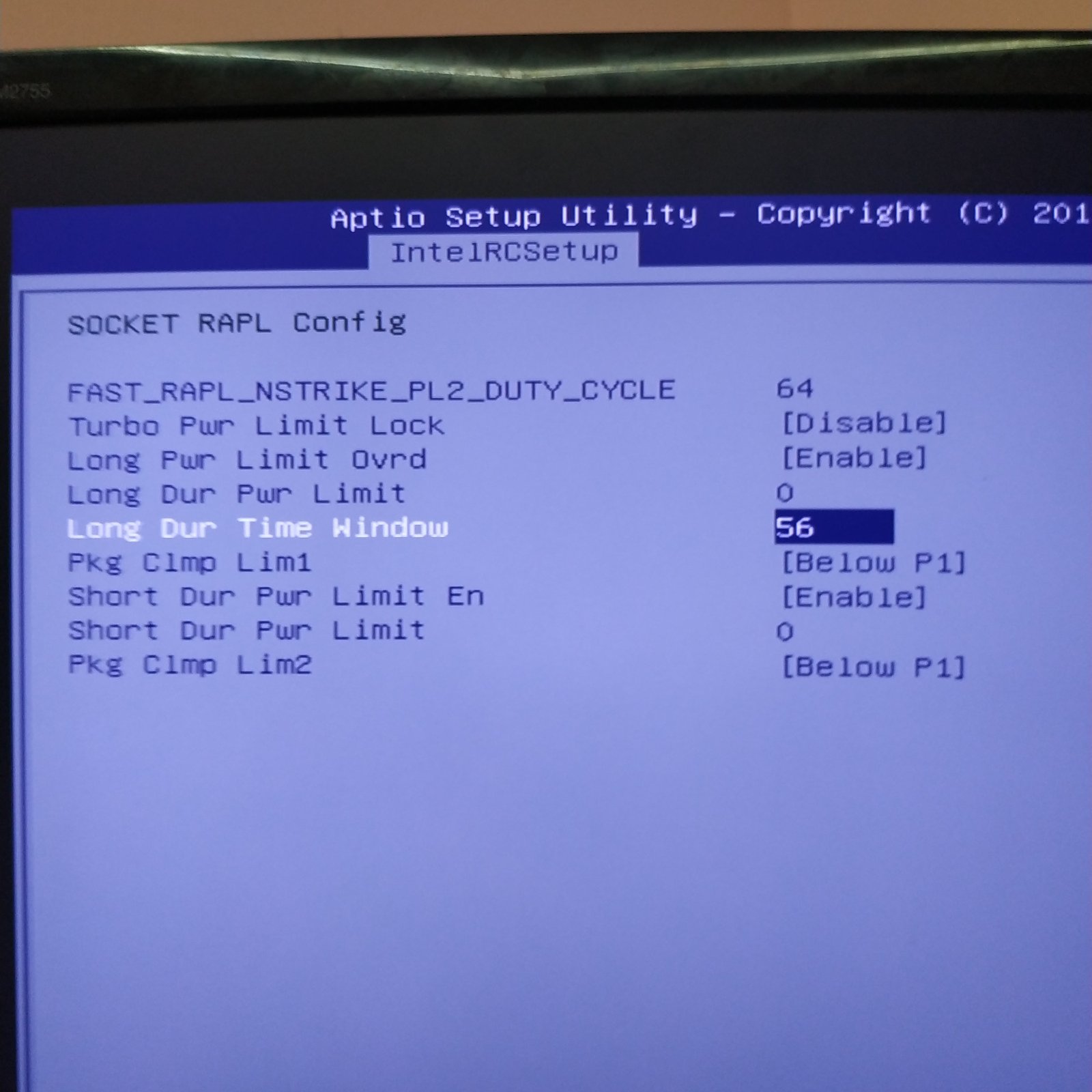 Также рекомендую на постоянно включить лимит сверхпотребления на 56 секунд Long Dur Time Window IntelRCSetup > Advanced Power Management Configuration > Socket RAPL Config