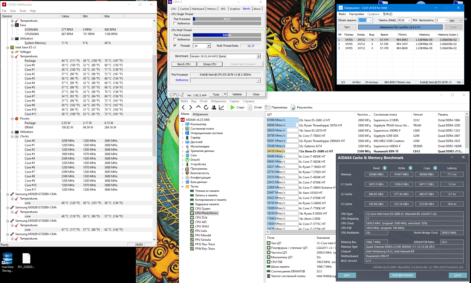 Для разгона множитилем как правило достаточно настроек стокового биоса, но в любом случае не прошивайте биосы предназначеные для анлока турбобуста процессров с заблокированым множителем, типа"с повышенным повер-лимитом и открытыми дополнительными настройками QPI". Для плат Huananzhi и других, использующих схожий биос, нужные настройки находятся в меню IntelRCSetup > Overclocking Feature > Processor и IntelRCSetup > Overclocking Feature > CLR\Ring. Основные параметры: Core Max OC Ratio — множитель ядер. Для Xeon E5 1650 v3 можно сразу установить 41-42. Core Voltage Mode — можно выбрать динамически (Adaptive) повышать напряжение или сделать статическим Core Voltage Override — выставляем напряжение на процессор в милливольтах, к примеру 1250, это будет 1.25 вольта (начать можно как раз с этого значения). Выше 1.30 поднимать с осторожностью! CLR Max OC Ratio — множитель контроллера памяти. По умолчанию равен 30, можно плавно повышать до 33-35 и тестировать производительность и стабильность. Core Voltage Mode — напряжение контроллера памяти. Аналогично Core Voltage Mode, но не выше 1250. Процессоры Haswell очень чувствительны к напряжению контроллера памяти, более-менее оптимальным считается 1.25 вольта, поднимать выше стоит с особой осторожностью.