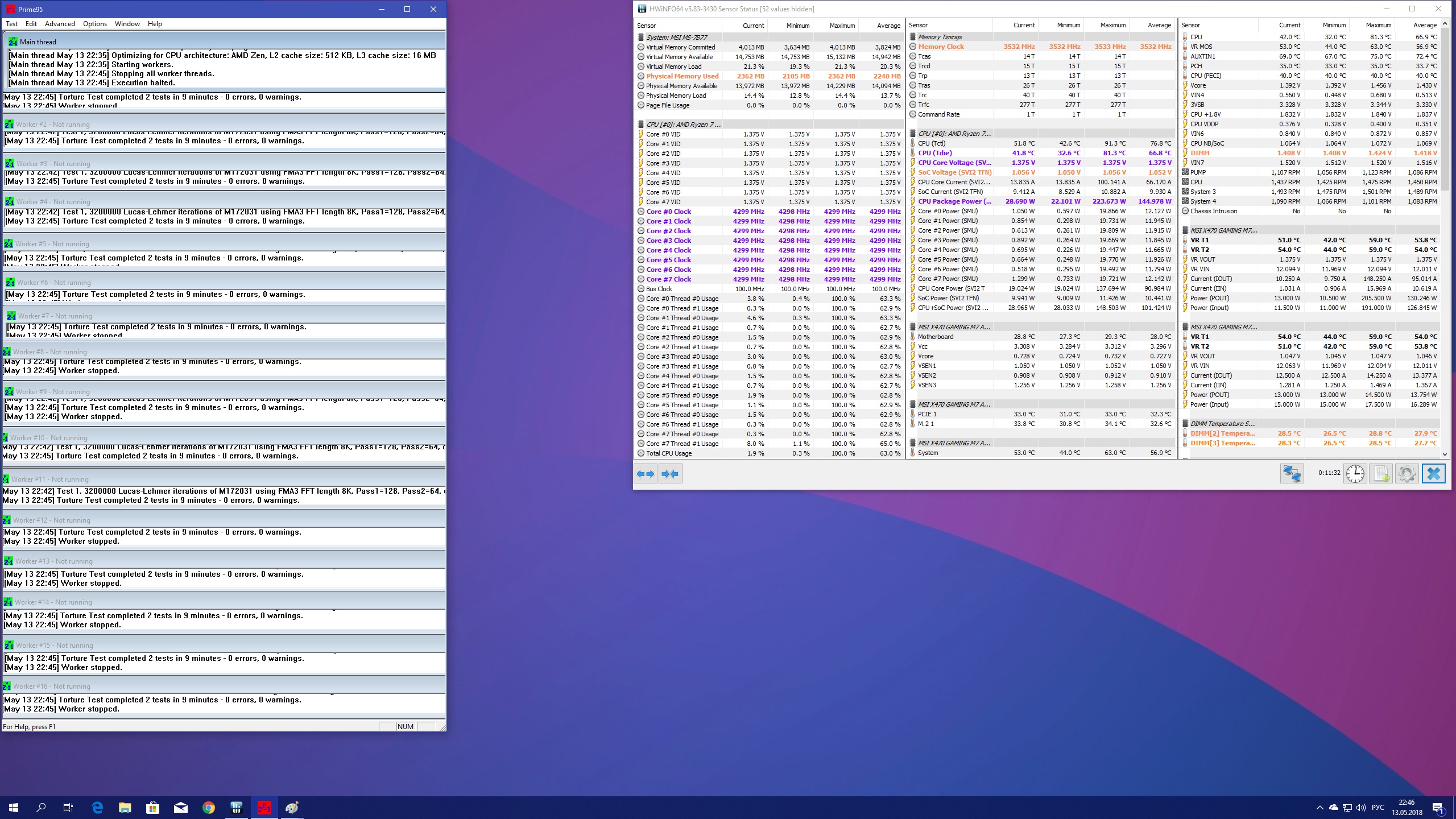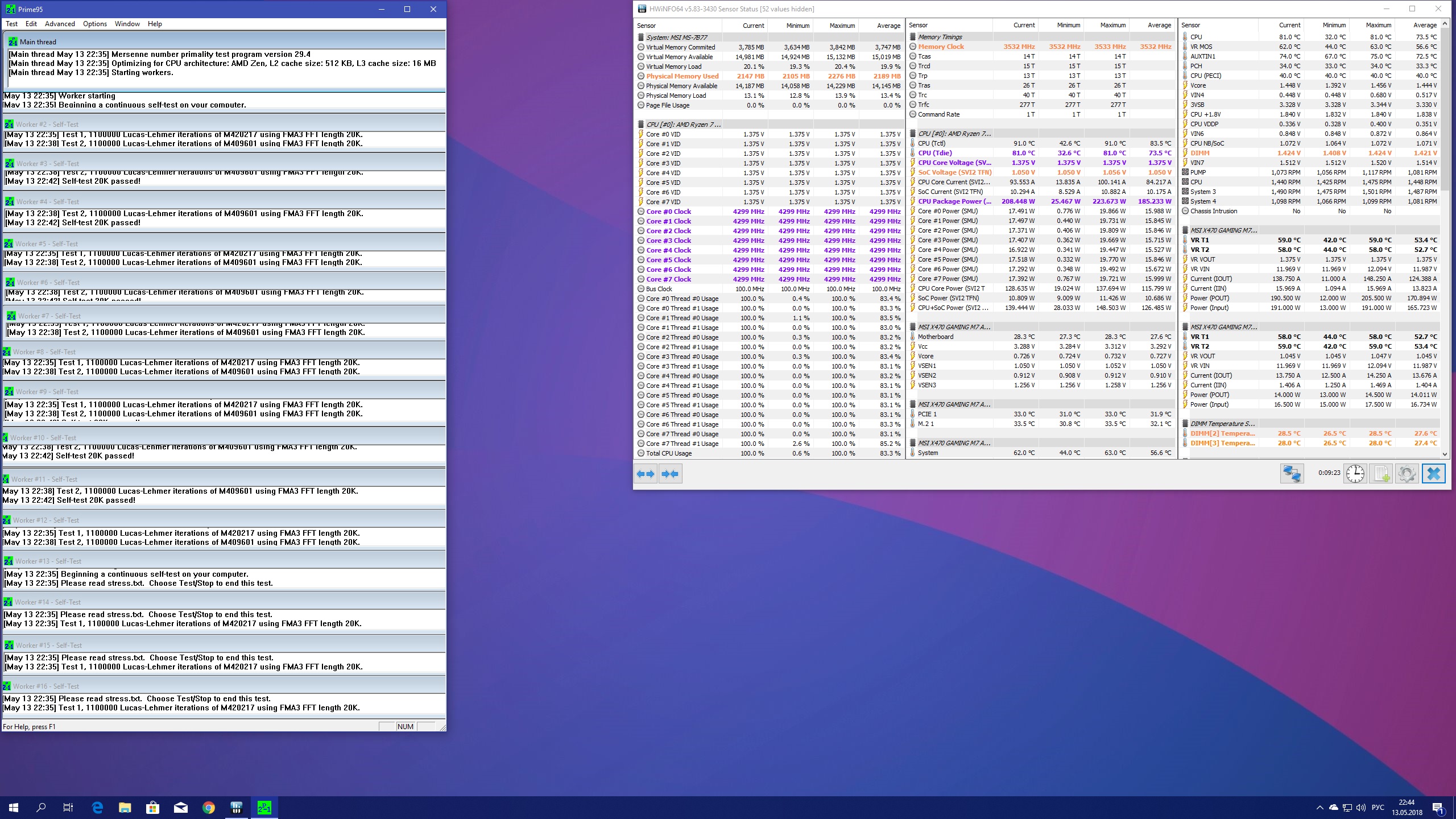 2) Результаты Аида фулл стресс проц 55гр CPU+FPU+Cache+RAM+GPU Память взяла 3400 14-15-15-15-30-1t, скрин из Thaiphoon Burner не выкладываю т.к. он не определяет установленные чипы. Но судя по результату, там Samsung b-die. Тайминги брали из калькулятора, считал Safe для 3466, но не падает только на 3400. Возможно, если еще подшаманить, можно получить больше.
