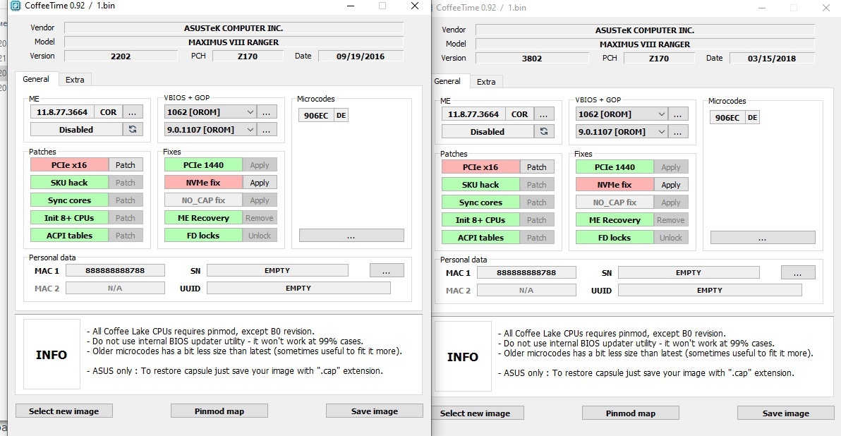 Всем привет. Заказал себе всё таки QNCT. Пока едет покурил тему, накидал самопальный биос вроде как правильно. Сравнил его с тем, что прислал китаец и возникло несколько вопросов: 1.Почему он собрал на 2 версии биос а не на третьей? Есть критическая разница? 2.Как влияет версия ME, если она по сути отключена. Вроде как правильнее ставить 11.7 corp., но есть ведь и новее. 3. QNCT - добавил микрокод 906ea-DE, у китайца 906ea-B4. На сколько я понял этот цп с микрокодом 906ea-DE не работает на 200 серии матерей. C 100 должно поехать. Разница в версия на работу влияет? Скрины прикрепил. С таким конфигом скаи и кэбилейки должны же тоже работать?
