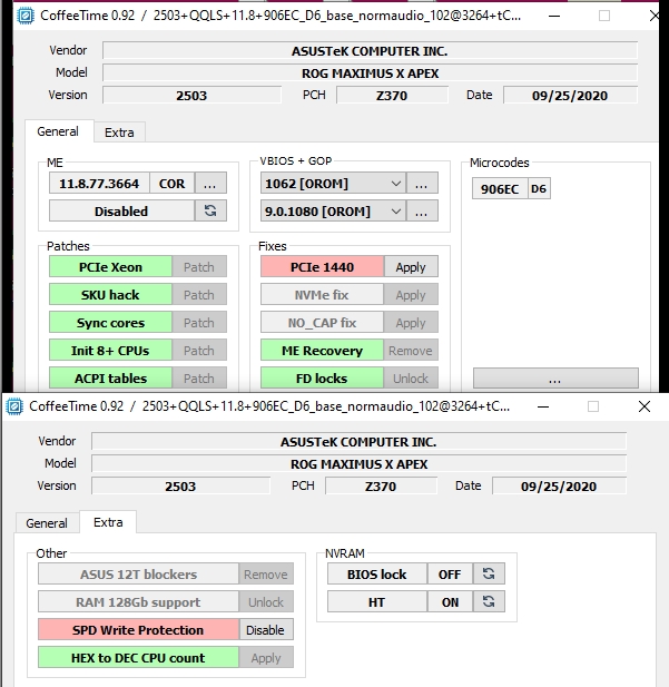 Всем привет, нужна помощь. Материнская плата asus z170-k пытаюсь запустить qqls. Программой coffeetime 0.92 делал мод. при первом запуске биос сразу перекидывает меня в программу прошивальщик "изифлеш" и все дальше ни чего не дает сделать. Что я мог сделать не так ? еще вопрос нужно ли в кофетайм патчить пункты pcie1440, nvme fix, no_cap fix, me recovery, fd locks. просто я все что было красным помечено , то и применил.
