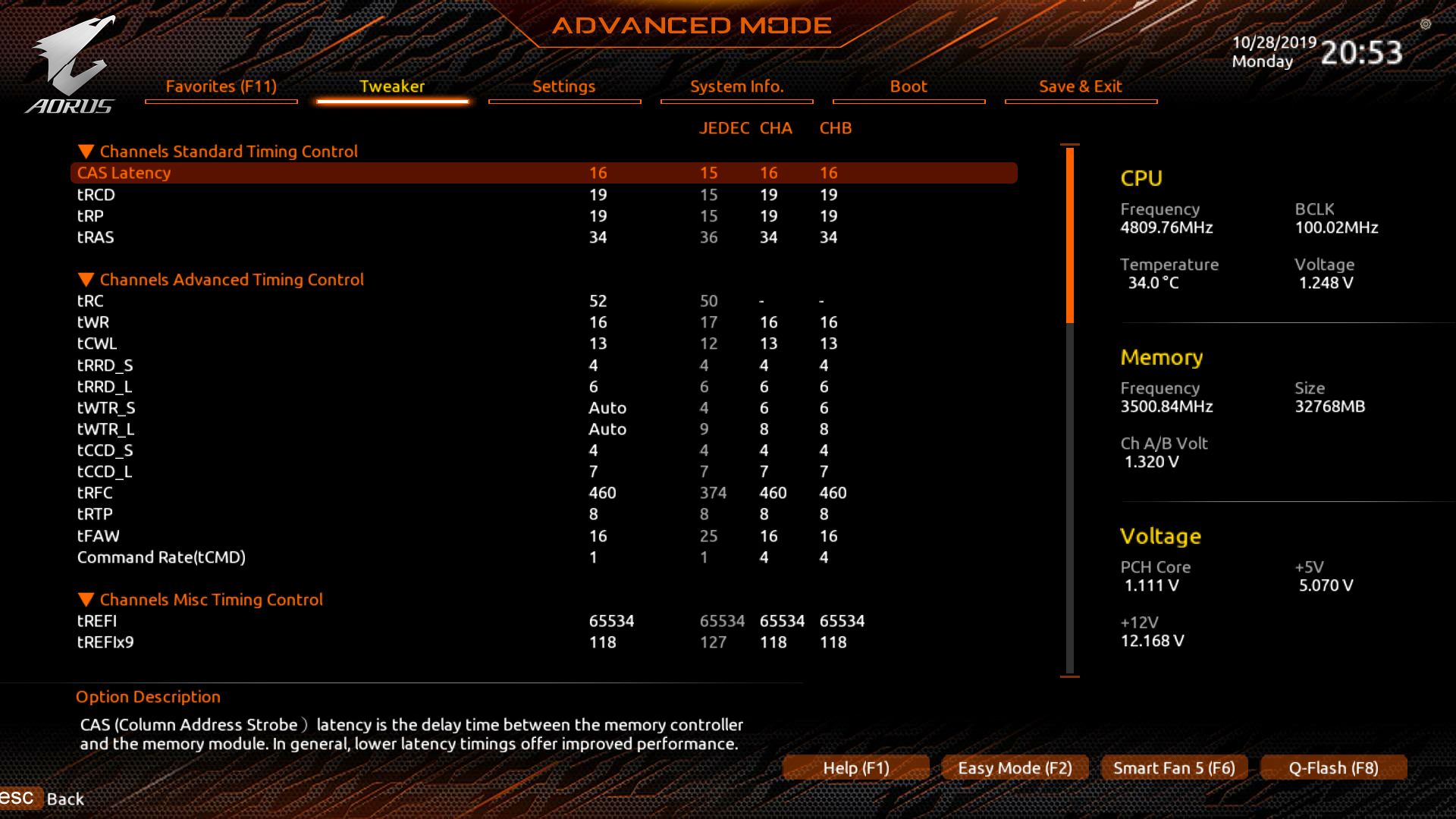 Кто знает как настроить биос на матери z390 aorus pro. Без разгона процессора, только память стоит на штатных частотах 3600 Настроить я имею ввиду что то выключить, какие то лишние пункты может быть и все такое. И есть где нибудь гайд по разгону оперативки на этой матери? Какие пункты надо править? Тут проблема нарисовалась.. Я уже давненько купил эту мать, настроил оперативку, люди здесь помогли на форуме. Прошло уже наверное больше полугода и я тут сегодня решил обновить биос и все настройки сбросились. И так как я не занимаюсь разгонами и всяким оверлокингом, я понял что я нихера не помню как я здесь настраивал память. Ну частоту и тайминги то понятно что и где крутить, только на одной планке по моему, вторая автоматом так же станет? А что еще надо править?