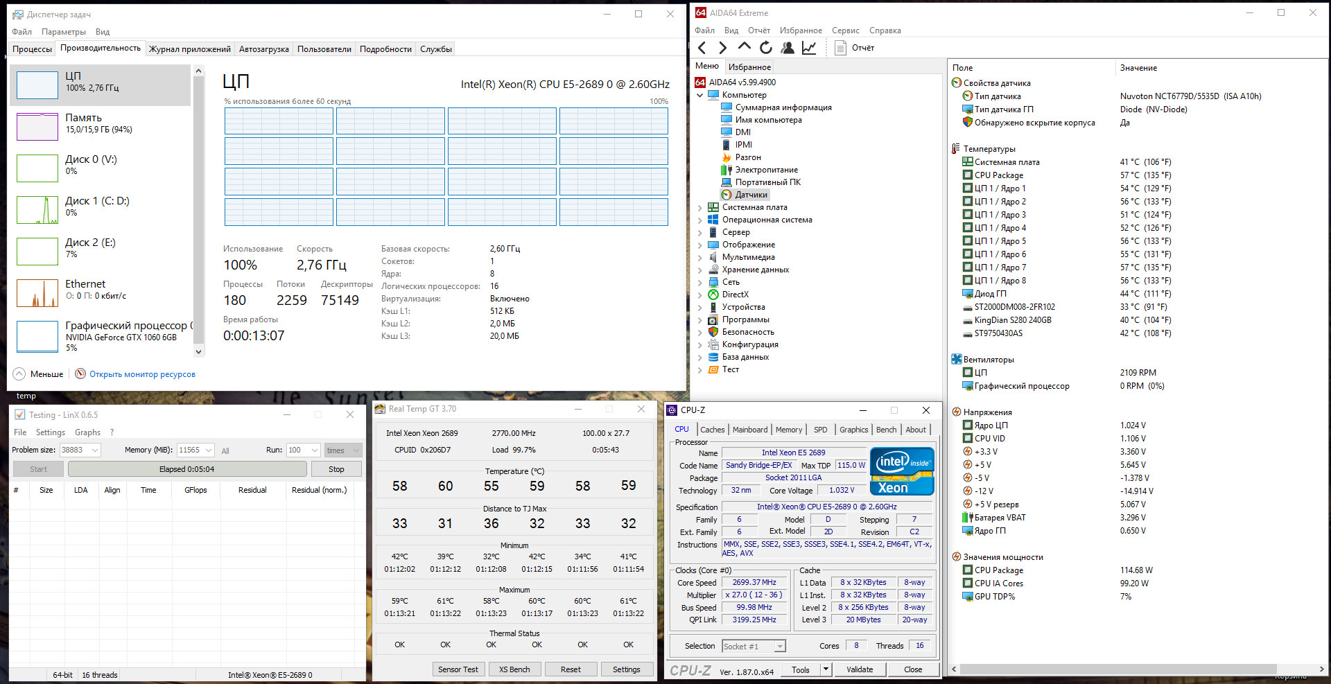 Зачем я всем этим занимаюсь. Я пока не купил материнскую плату для 2689. Хочу понять хороша или плоха моя Huanan X79 Deluxe 6.11 именно для этого процессора. В играх мне меньше 3,3 ггц не удалось увидеть. Стресс тест Linx показал, что процессор сбрасывает частоту вплоть до 2,73 ггц. Но у Ремонтяша то как-то получалось 3,1-3,2 ггц. Пересмотрел его видео. А он то в аиде тестировал! Вот только он не показал с какими именно настройками. А чем я хуже - тоже прогнал аиду: