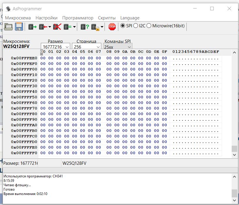 Для CH341A рекомендуется использовать программы: - CH341A Programmer v1.18 [Скачать] - AsProgrammer [Скачать] - Colibri [Скачать]