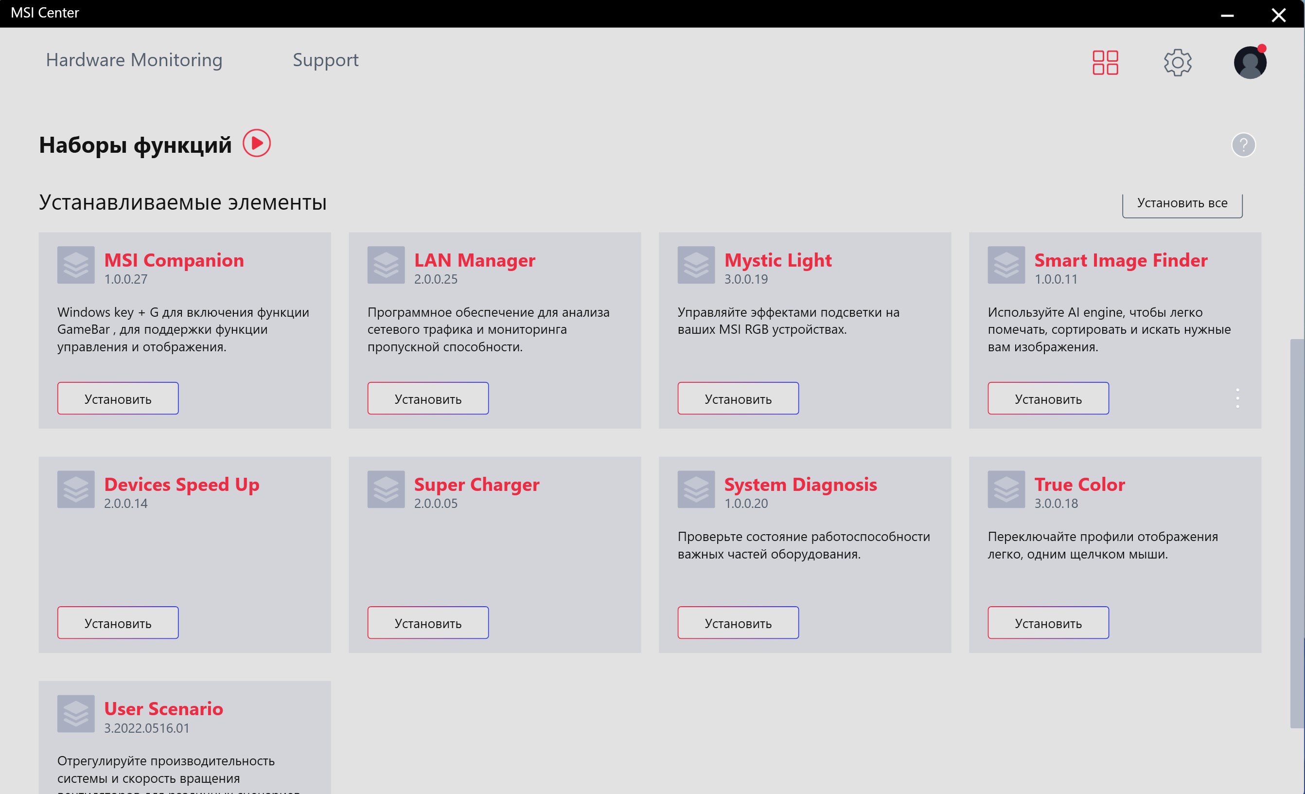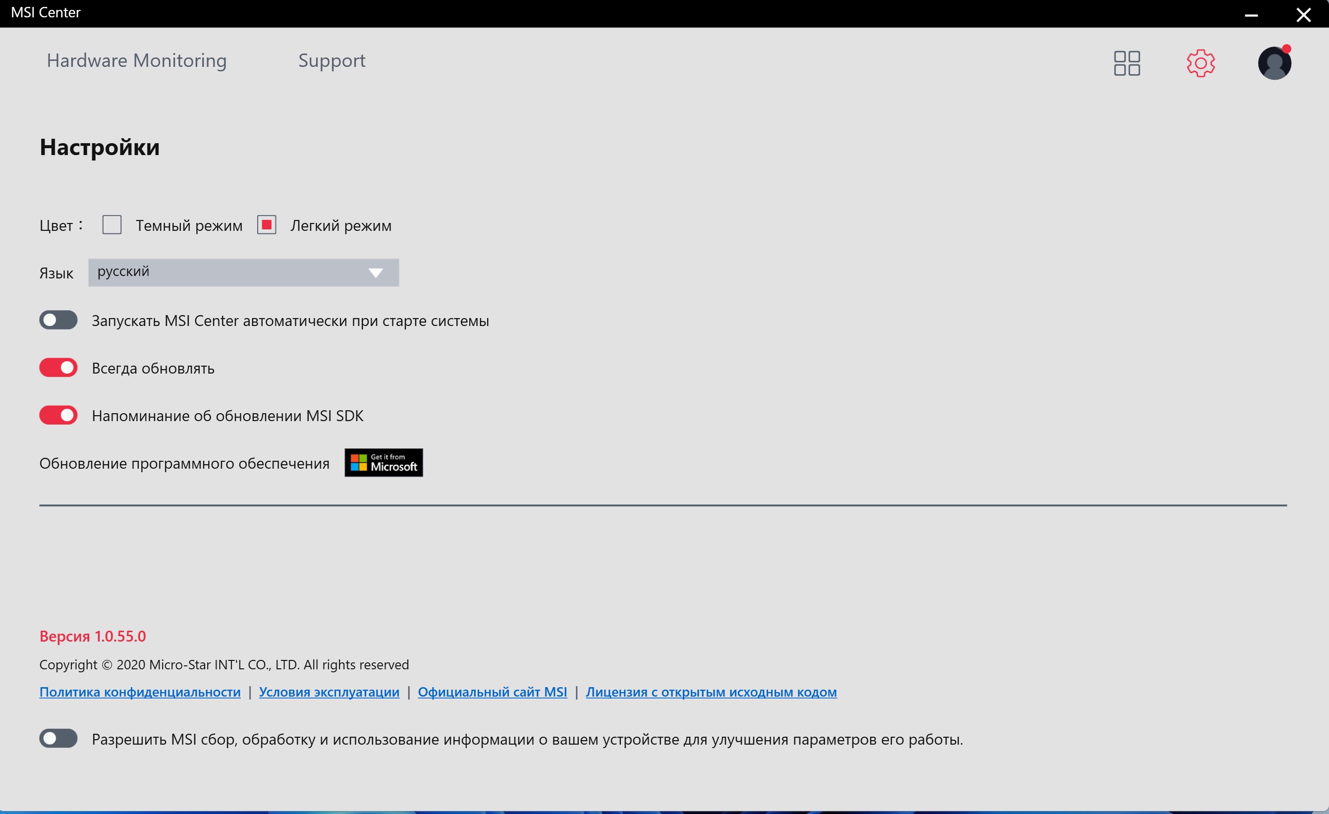 Единственное место, где тут есть хоть что-то про управление вентиляторами - это пользовательские сценарии, но и там все очень печально. Предустановленные режимы тихий и прочие, кривые до ужаса, без возможности настройки, в пользовательском пресете можно настроить кривые, но там не выбрать ни источника, ни настроить гестерезис... Версия MSI center, последняя доступная на сайте, при первом запуска она скачивала какие-то обновления, но так и осталась 1.0.55.0.