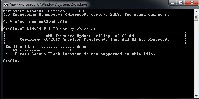 Jep_Pavel Скачайте AMI Flash Utilities Распакуйте и возьмите файл amiflash\Aptio\afuwin\64\afuwin64.zip\AfuWin64\AFUWINx64.EXE И прошейте: AFUWINx64 P11-B0.rom /p /b /n /r Если не поможет, то AFUWINx64 P11-B0.rom /gan