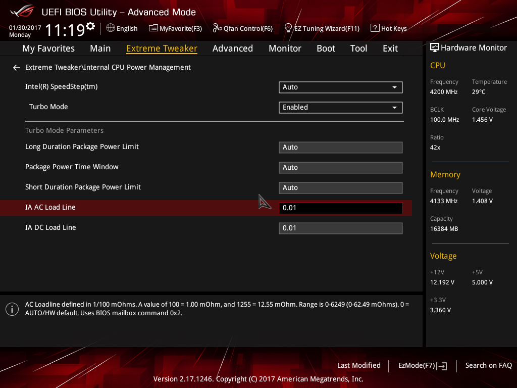 На платах ASUS, первый раз зайдя в BIOS Setup, установите значение «0.01» для параметров «IA AC Load Line» и «IA DC Load Line».