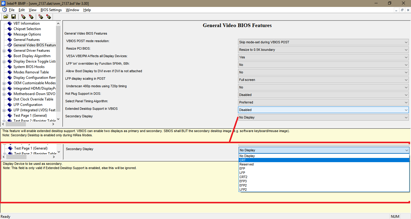 Дополню зачем это нужно. Пытаюсь помочь пользователю(ям) ноутбука Asus X550CC с разбитой матрицей. (У меня есть такой же ноутбук, но работоспособный). Он не видит смысла восстанавливать дисплей и использует вывод изображения на VGA. Вот только изображение UEFI BIOS у него не доступно. Как оказалось, оно выводится при закрытой крышке (по обработке сигнала LID_SW#), чтобы выводить изображение с UEFI BIOS нужно нажать кнопку включения и быстро положить магнитик на датчик Холла закрытой крышки. Проблема еще возникла с тем, что он этот датчик отломал и потерял при разборке ноутбука. А иммитация работы датчика через кнопку у него не получилась. Если я правильно понял, в iBMP есть возможность настроить "зеркалирование" (clone/twin), для "video BIOS POST boot up display device", то есть выводить изображение одновременно на VGA и LFP, и нужно просто отредактировать таблицу битов "Boot Display Algorithm". Но так как это в OROM VBIOS, то он же не используется, а править настройки GOP VBT я не могу без нужного для 165 версии (да вообще ни для какой нет) BSF шаблона. Верно? Еще в OROM VBIOS начиная с 2137 есть опции Secondary Display.