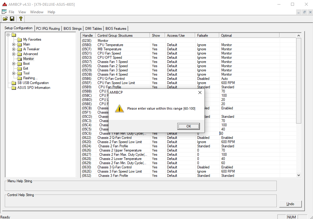 Друзья, можете мне, пожалуйста, помочь советом как произвести (а точнее как найти в моём биосе) для материнской платы ASUS X79 Deluxe настройку chassis 3 fan min. duty cycle(%%)? Проблема в том, что в настройках биоса этот параметр ниже 60% не устанавливается, а мне хотелось бы иметь более обширный диапазон регулировок.