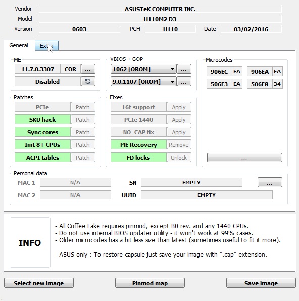 Имеются 3 версии BIOS-а 0603,0402 и 0216 Процесс проводил сначала на QNCT - ни в каких комбинациях не работает, потом решил вставить Pentium G4400 и посмотреть, а запускается ли всё в принципе. - На 0603 заблокирована кнопка PCIe 1440, я так понимаю версия уже не подходит. Если заменить версию ME, то при старте требует cap файл, подкидываю cap, биос его шьет, ребутается и снова требует. Если просто запретить ME, заменить VBIOS+GOP и применить доступные патчи - получается работоспособный на пеньке биос. - в остальных версиях доступен патч 1440, но замена ME или его запрет - материнка только циклично на секунду дёргает кулером.