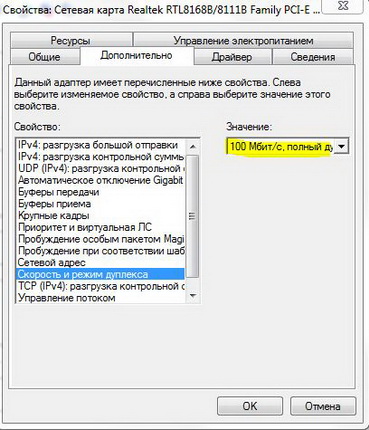 Igor8002 1) Для начала обновите драйвера под сеть, потом зайдите в свойства сетевого адаптера через диспетчер устройств. Там в настройка должно быть что-то вроде "Speed & Duplex", попробуйте вручную указать 100Mb Full Duplex.