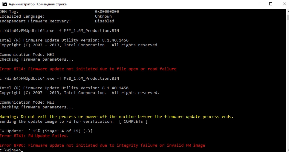 gerrard666 MEI проще всего зашивается через биос, а именно, берем новый или нужный биос, пишем на флешку, вырубаем комп, вставляем флешку в нужный юсб и жмем как надо кнопку (как шить и переименовывать есть на первой странице) и никаких ошибок и проблем. А конкретно по твоей ошибке в теме есть похожие случаи и не один