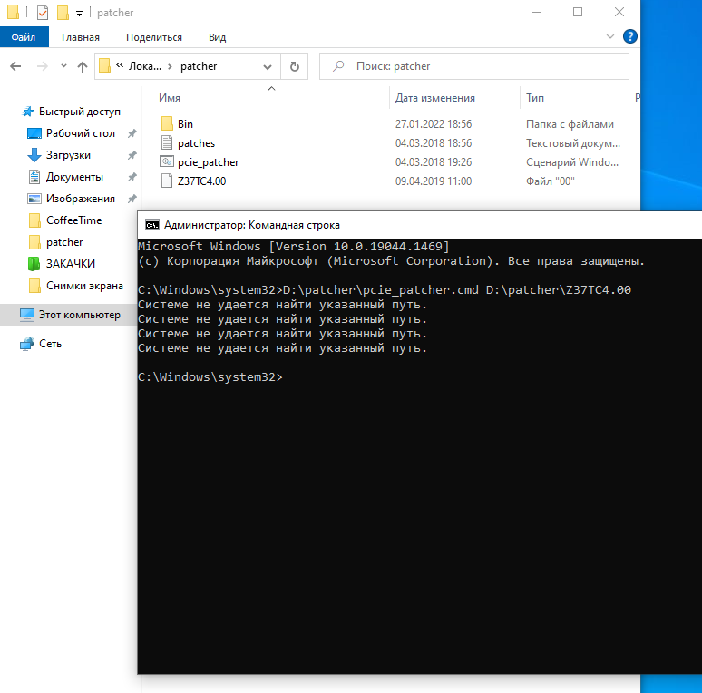 Либо, как написали выше, сначала перейти на нужный диск и в нужный каталог (тогда можно писать pcie_patcher.cmd biosname.rom, т.е. пути уже не указывать, поскольку мы уже стоим в этом каталоге, где лежат файлы)