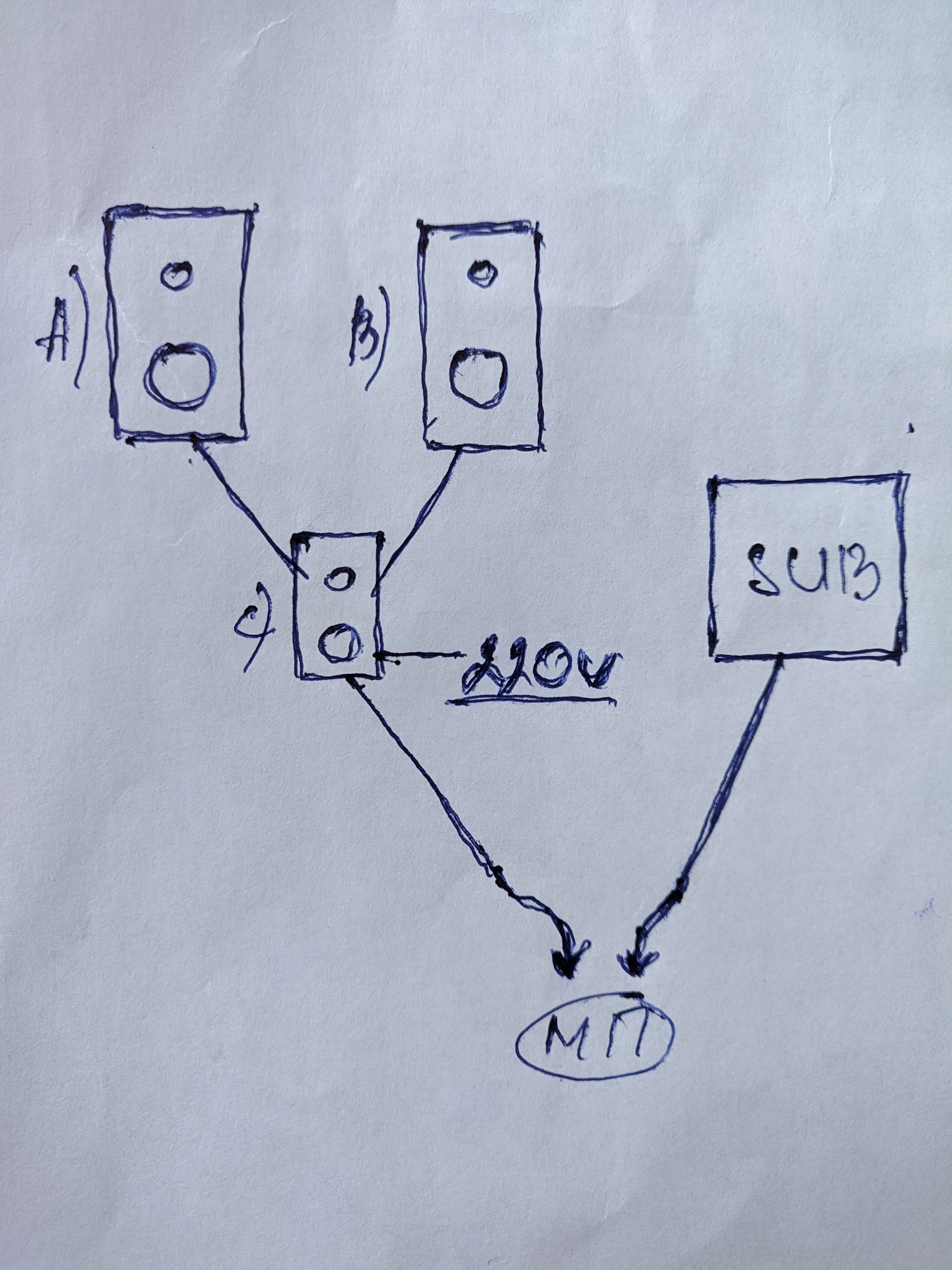 HotGuy вот так. Колонки A и B - это колонки, не имею собственных штейкеров, они раньше подключались к усилку. Они спаяны с проводом колонки C и подключены к ней (чёрный провод), а от неё к материнской плате (красный и белый) подключены уже к зелёному разъёму. Сабвуфер к МП подключён самостоятельно в оранжевый разъём.