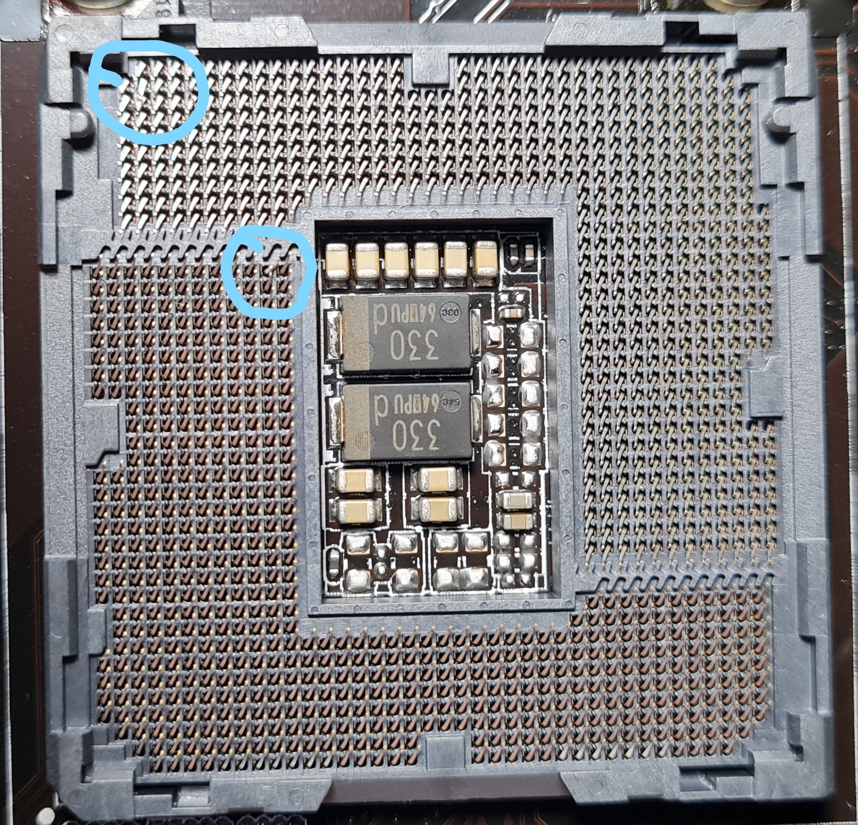 Привет всем! Прошу простить что не по теме, я купил плату в онлайн магазине, дома начал сборку для теста далее открываю сокет и вижу такое, загнуты или согнуты пара контактов в сокете!. Может кто знающий скажет за что они отвечают? искал по интернету распиновку сокета но то что нашёл ясности не внесло. Р.S. Никогда не проверял сокет новой матери в магазине но если только когда покупал по уценке