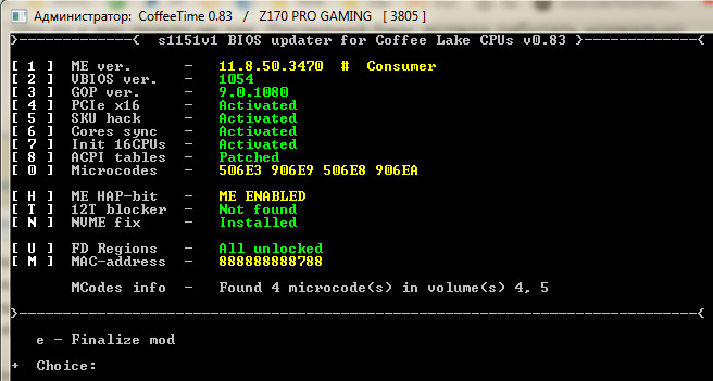 В этом случае нужно добавить необходимый микрокод через Advanced mode. Вводим «0», потом удаляем все микрокоды, введя «0», далее добавить те, которые Вам нужны, исходя из ревизии (пункт 3.1 Ревизии Coffee Lake). Количество места под микрокоды ограничено, поэтому обычно можно добавить не больше трёх, зависит от биоса мат.платы. Завершаем модификацию, если больше не требуется никаких изменений, после ввода «e». #77 Модифицированный биос можно считать готовым!
