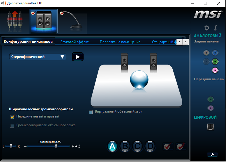 в Realtek HD отключить бесячее оформление MSI в котором я даже разъемы переназначить не могу.