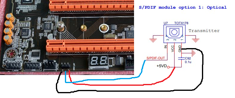 И снова привет,как на счет Optical S/PDIF на хуананжи? Да оно есть на GAMING DELUXE G279t v6.11,делается просто. черный -GND красный - 5v синий - сигнал с alc892 48 ножка out spdif.